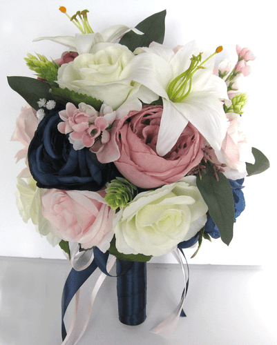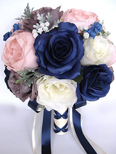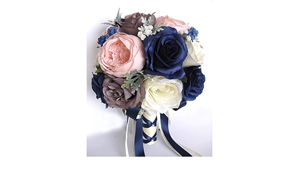 Amazon Com 17 Piece Wedding Bouquet Package Bridal Bouquets Silk Flower Bouquet Navy Blue Pink Blush Gray Bridal Flowers Centerpiece Rosesanddreams Home Kitchen